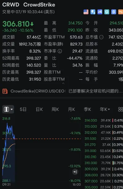 不过,仍有多家公司的股价受到影响,如威瑞森电信美股盘中跌超1.2%,消息面上,该公司称,全球范围内影响各公司和行业的IT问题对公司产生了一定影响。CrowdStrike更是出现暴跌。