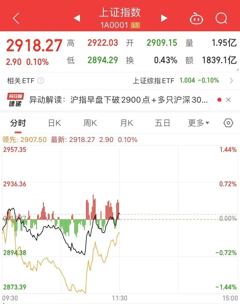 震荡的A股市场,上午上证指数一度失守2900点整数关口,而后又V起收复,上午收盘指数站在2900点之上,红盘收涨。