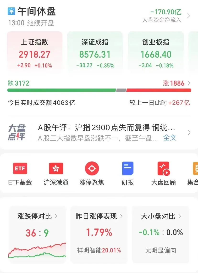 上午收盘,在电力、石油、银行等权重的助力下,上证指数微涨0.1%,深证成指跌0.35%,创业板指数跌0.18%,科创50指数微跌0.06%,个股跌多涨少,3172只下跌,1886只上涨。上午市场成交额4063亿元。