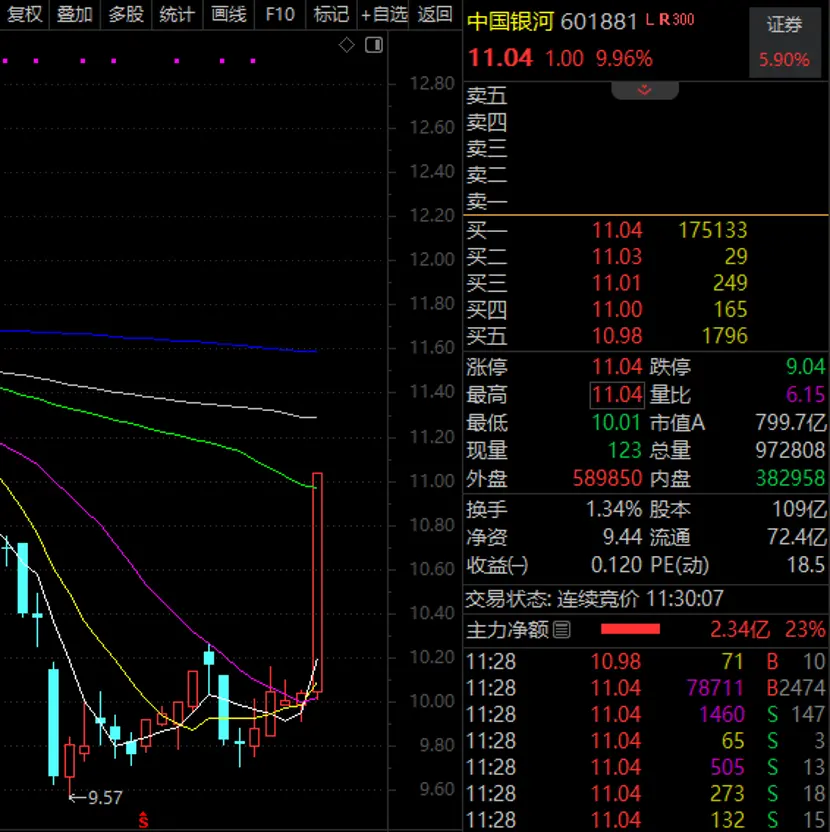 截至上午收盘,证券板块集体上涨,市值超千亿元的中国银河也拉上涨停板;板块中,涨幅最小的东方证券涨近4%。