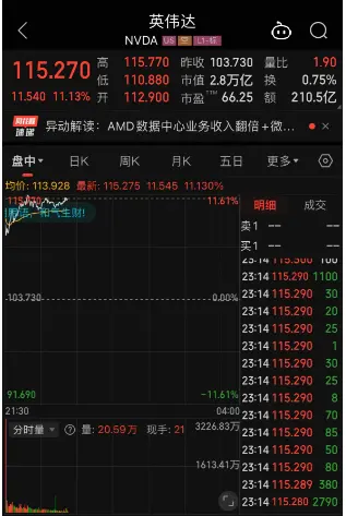值得注意的是,英伟达一度涨超11%,截至发稿,股价报115.27美元,市值已达到2.81万亿美元,较前一交易日暴涨近1.9万亿元人民币。