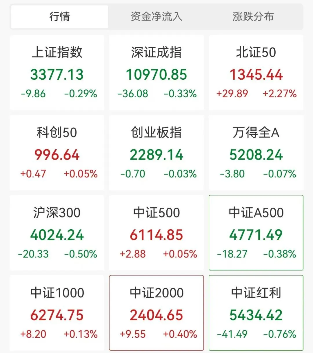 不过,临近11点,大盘转头向下。截至发稿,沪指、深证成指、创业板指均转跌,北证50指数涨幅收窄至2.5%以内。