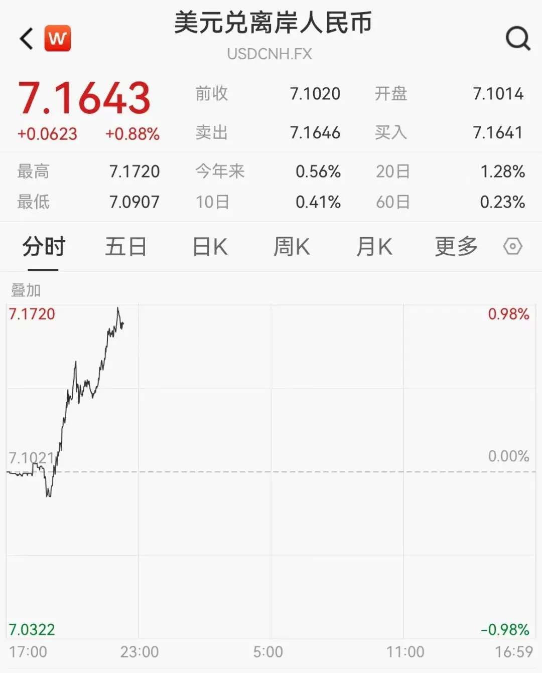 离岸人民币兑美元大幅走低,日内跌超600点。