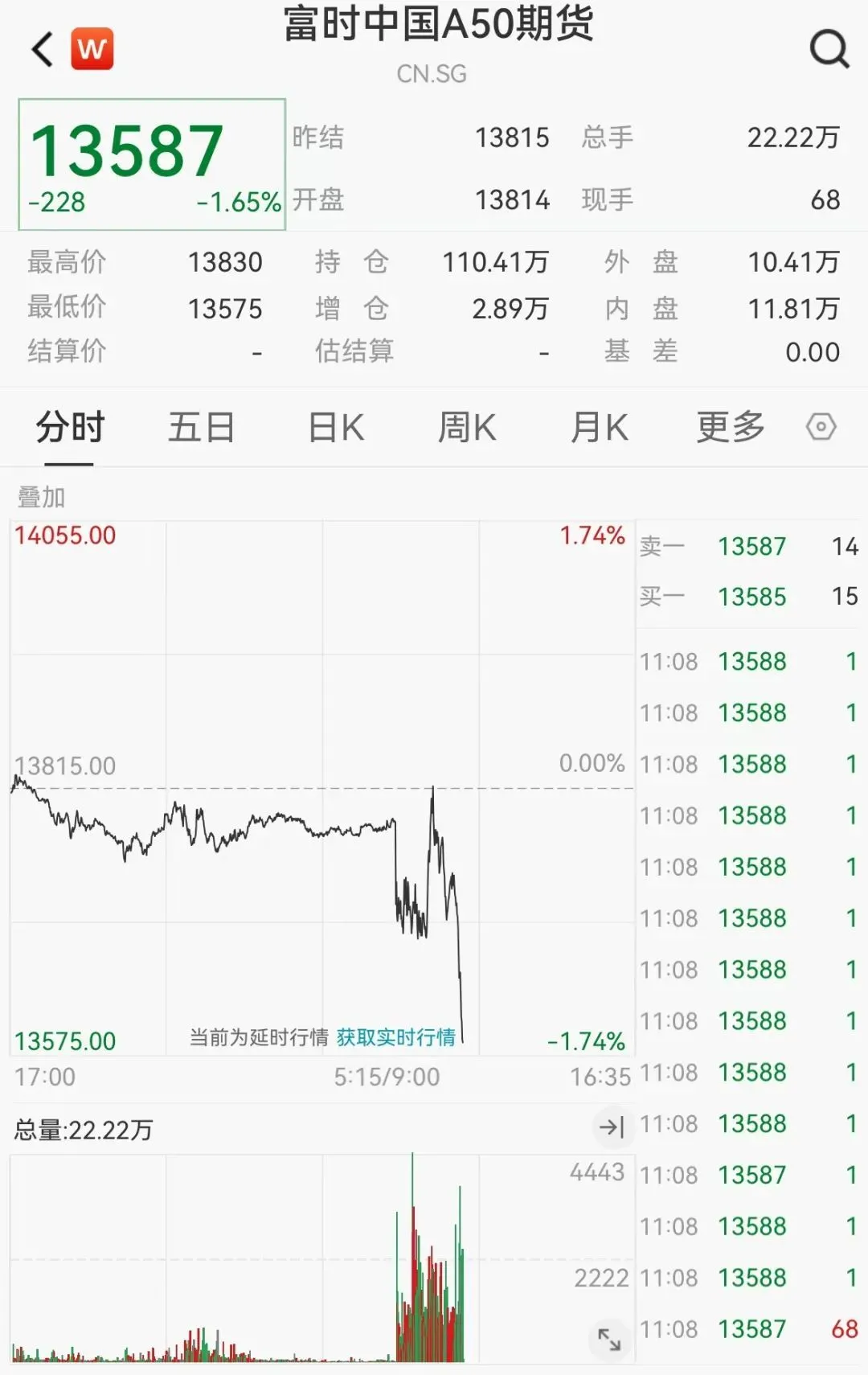除了A股以外,港股主要指数跌幅也同步扩大,恒指跌近3%,恒生科技指数跌超3%。新加坡交易的富时中国A50指数期货盘中一度直线拉升接近翻红,但随后又再次迅速走低,目前跌幅扩大至1.5%以上。