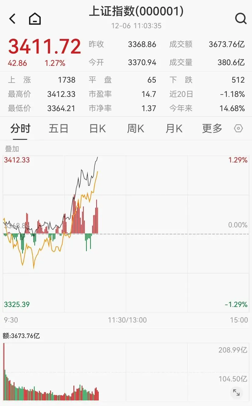 12月6日,A股市场早盘直线拉升,全线大涨。截至发稿,上证指数报3411.72点,收复3400关口,涨幅为1.27%,深证成指报10823.33点,涨幅为1.78%,创业板指报2271.47点,涨幅为2.25%。