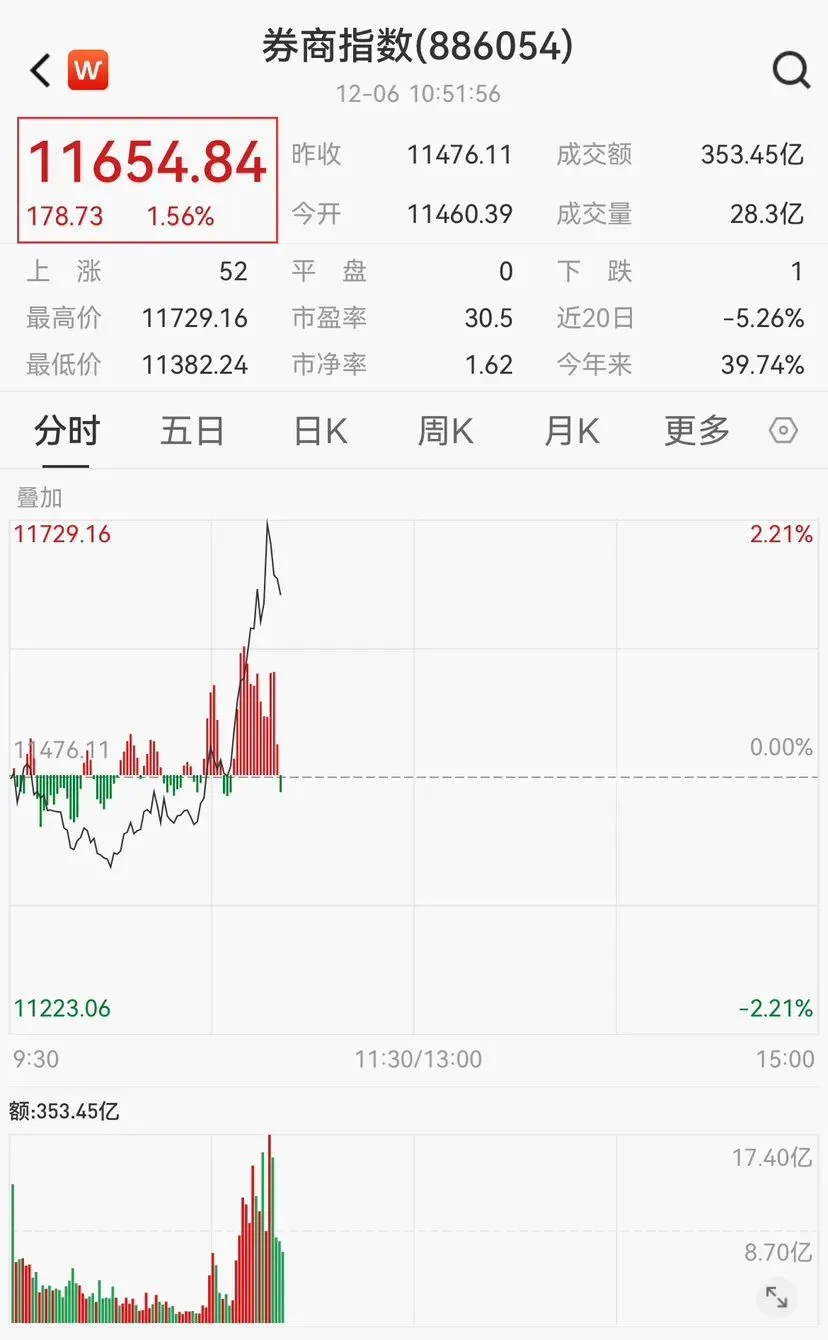 12月6日,A股市场早盘直线拉升,全线大涨,上证指数收复3400关口。大金融板块爆发,“牛市旗手”券商股带头冲锋,早盘阶段快速拉升。