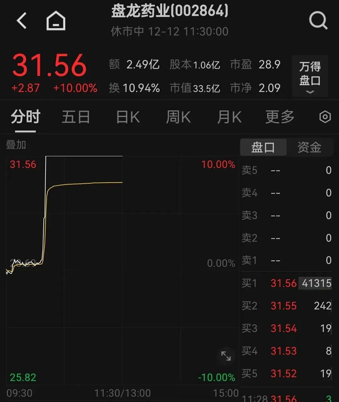 12月12日早上10点左右,中药板块集体拉升,盘龙药业突然直线涨停。