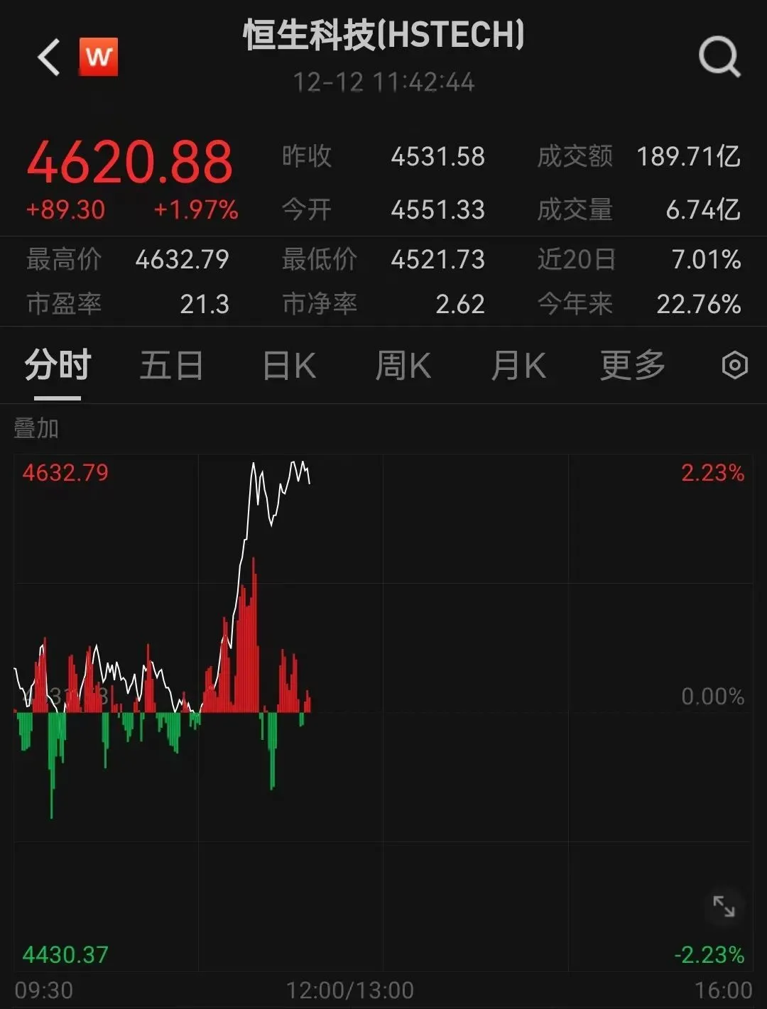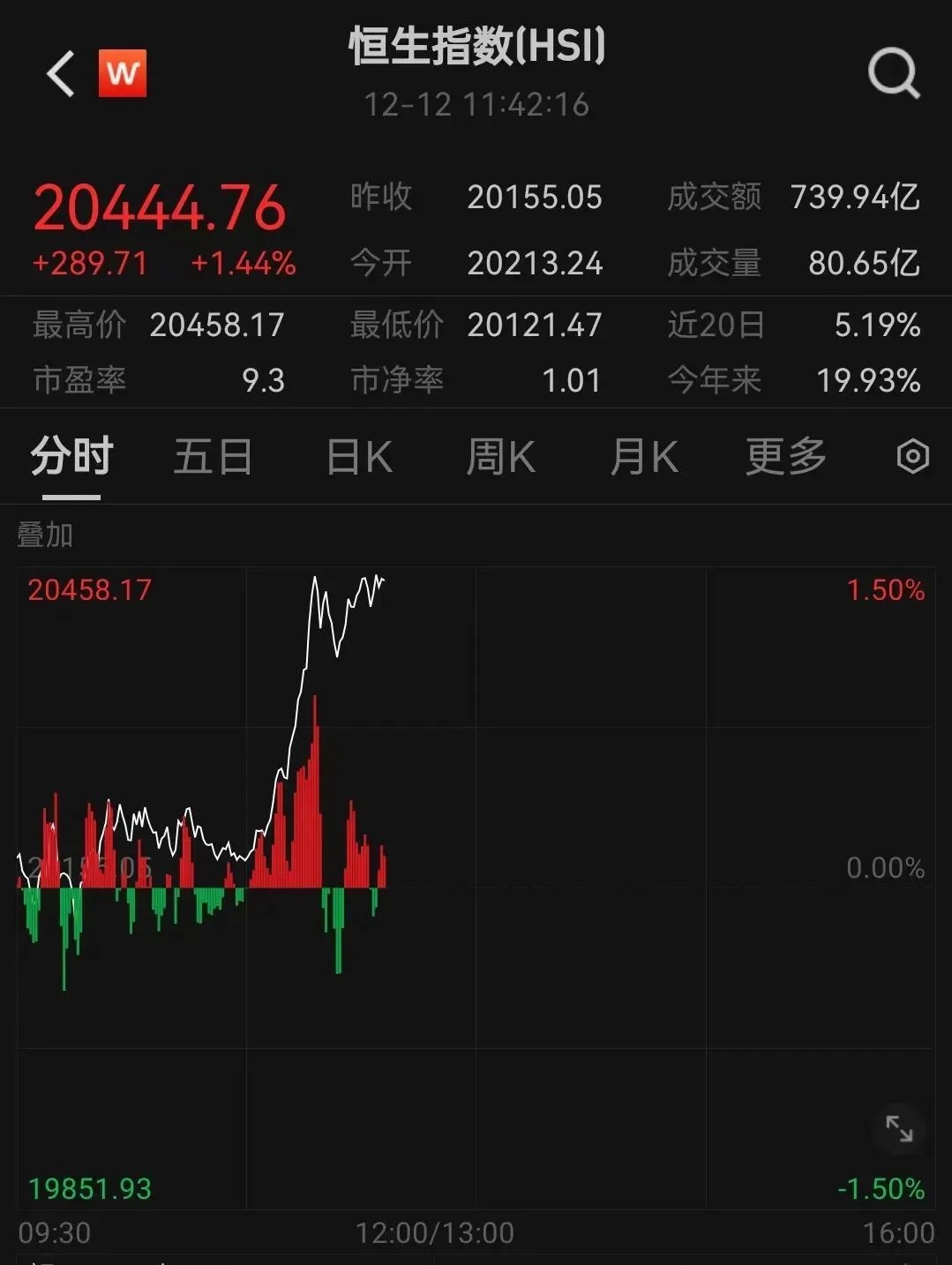 12月12日早盘,市场弱势整理,11点左右,港股突然直线拉升,截至发稿,恒生指数拉超1%,恒生科技指数一度涨超2%。