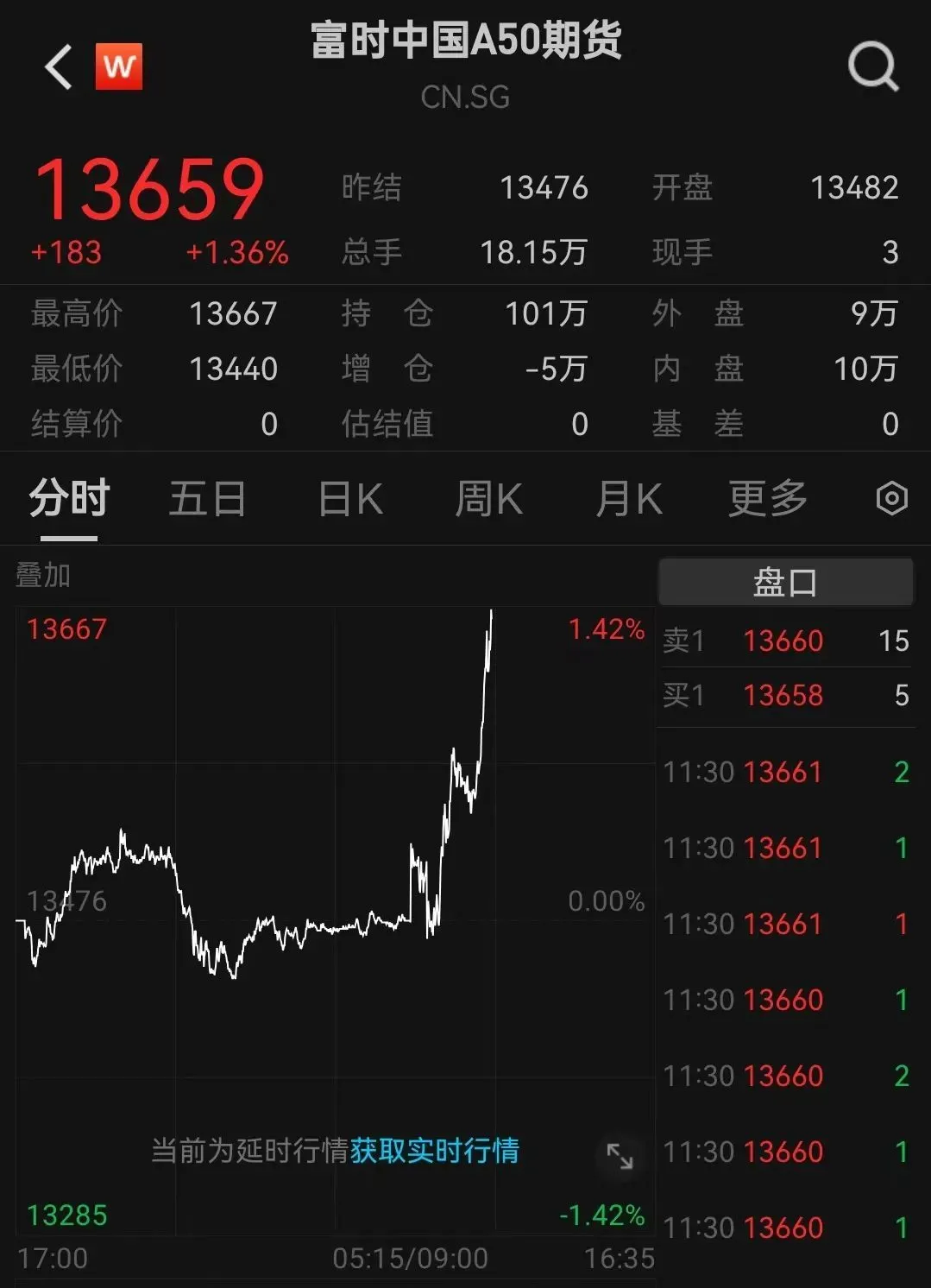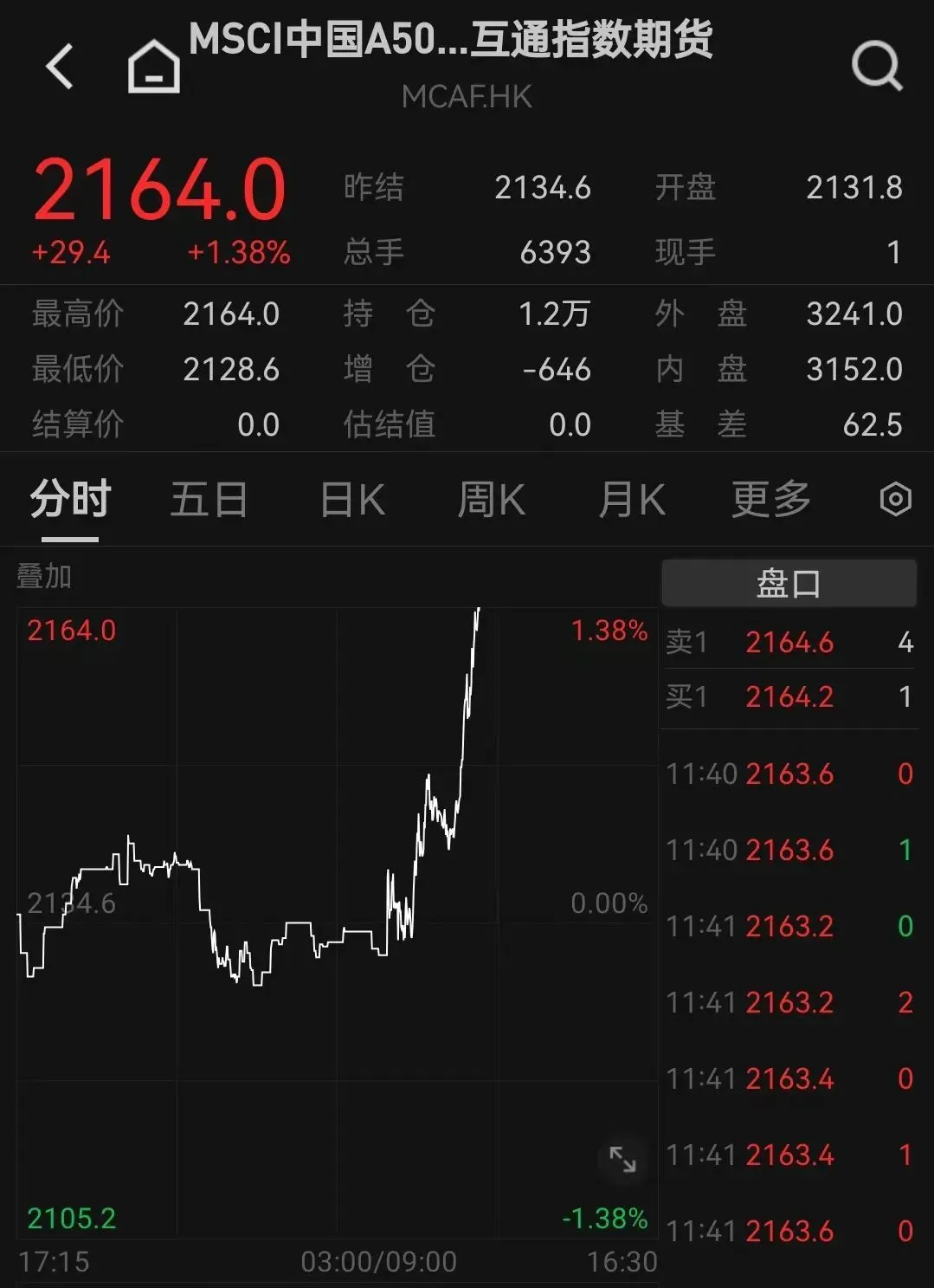 富时中国A50指数期货涨幅扩大至1.36%,MSCI中国A50互联互通指数期货涨超1%。