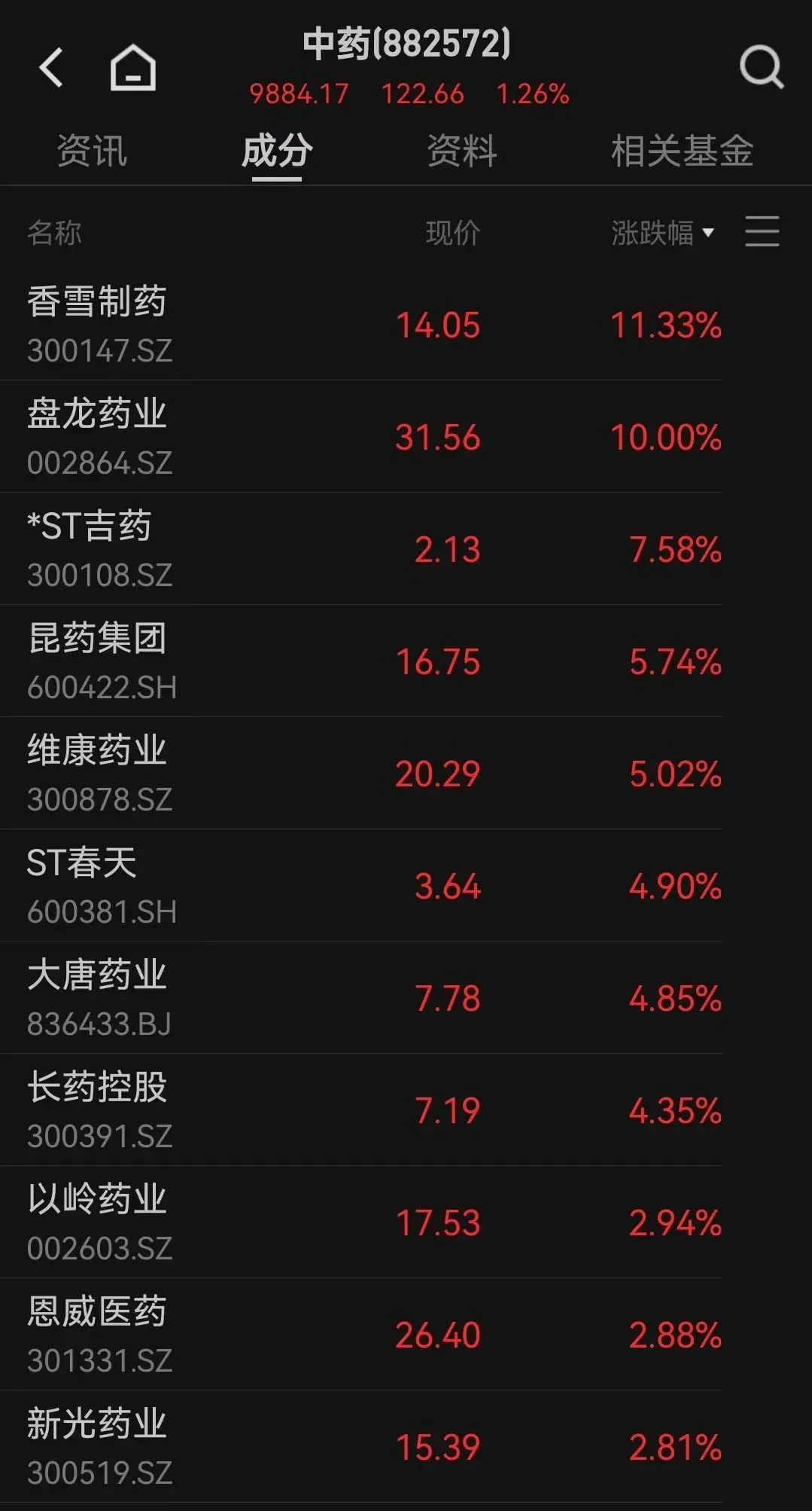 香雪制药、昆药集团、以岭药业、新光药业、长药控股等跟涨。