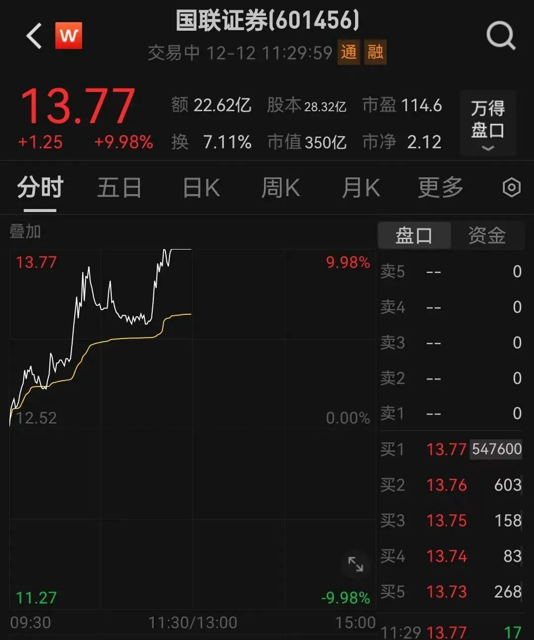 12月12日早盘,券商股午前拉升,国联证券快速拉升至涨停。