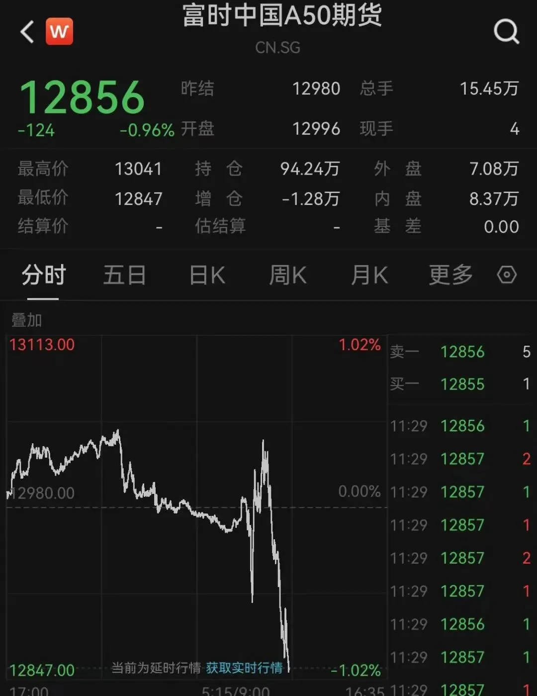 另外,此前一度翻红的富时中国A50指数期货,也出现跳水,截至发稿更是跌近1%。