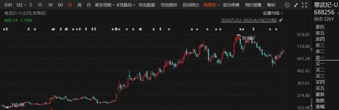 去年寒武纪股价大幅上涨,涨幅最高逼近五倍,最高价一度达到818.87元/股。