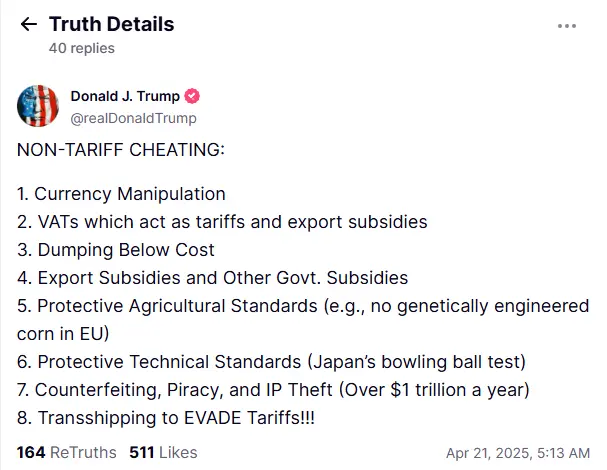 特朗普在社交平台列举了贸易中的8项非关税“作弊”手段,包括:1.汇率操纵,2.增值税作为关税和出口补贴,3.低于成本倾销,4.出口补贴和其他政府补贴,5.农业保护性标准(如欧盟禁止转基因玉米),6.防护技术标准(如日本保龄球试验),7.假冒、盗版和知识产权盗窃(年损失超过1万亿美元),8.转运避税。