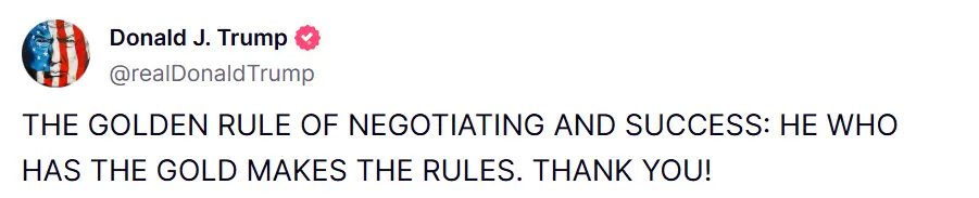 今早他在社交平台上表示,“谈判与成功的黄金法则:拥有黄金者制定规则。”