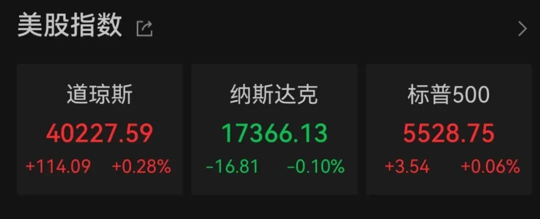美东时间4月28日,美股三大指数下探回升。截至收盘,道指涨0.28%报40227.59点,纳指跌0.10%报17366.13点,标普500指数涨0.06%报5528.75点。