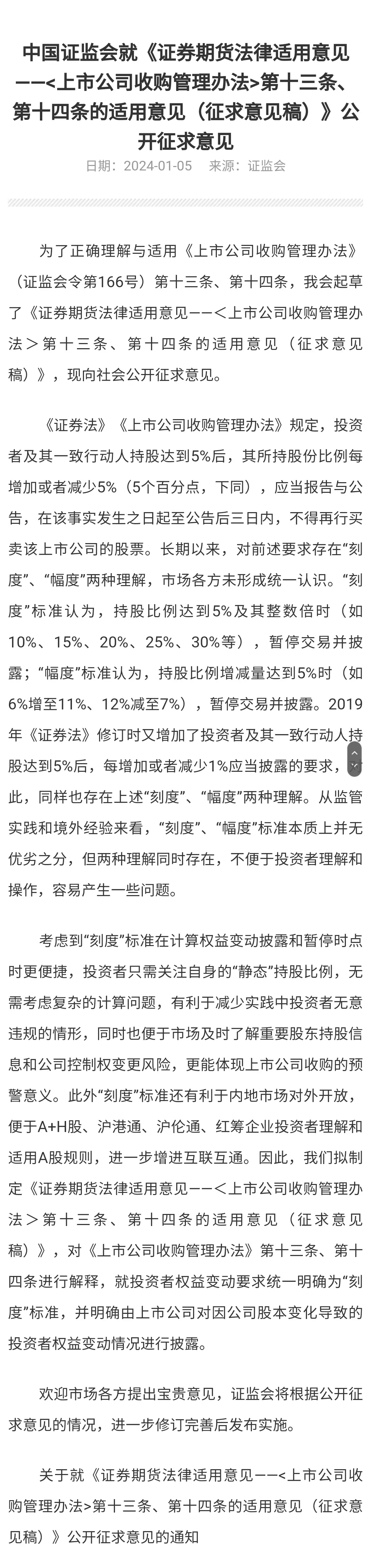 1月5日,证监会发文表示,为了正确理解与适用《上市公司收购管理办法》(证监会令第166号)第十三条、第十四条,证监会起草了《证券期货法律适用意见——<上市公司收购管理办法>第十三条、第十四条的适用意见(征求意见稿)》,现向社会公开征求意见。要点如下: