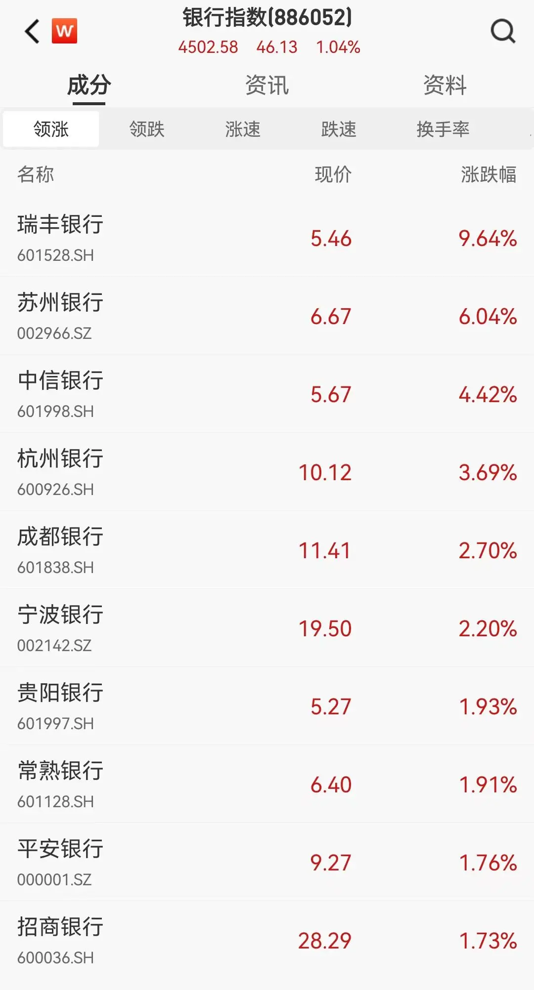 从涨幅居首的银行板块个股表现来看,瑞丰银行、苏州银行、中信银行、杭州银行、成都银行、宁波银行、贵阳银行、常熟银行、平安银行、招商银行、华夏银行、沪农商行、无锡银行、邮储银行等个股表现强势。