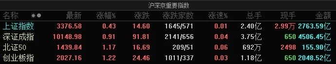 盘面上热点快速轮动,个股涨多跌少,全市场超3900只个股上涨。从板块来看,大消费股反复活跃,食品饮料等方向领涨,乐惠国际等多股涨停。固态电池概念股一度冲高,龙蟠科技等涨停。算力概念股展开反弹,太辰光涨超10%。