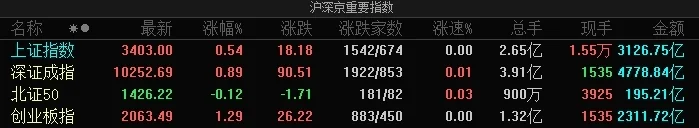盘面上热点较为杂乱,个股涨多跌少,全市场超3600只个股上涨。从板块来看,稀土永磁概念股集体大涨,中科磁业创历史新高。汽车零部件概念股表现活跃,迪生力等多股涨停。猪肉股震荡反弹,正虹科技涨停。下跌方面,创新药概念股展开调整,海辰药业跌近10%。