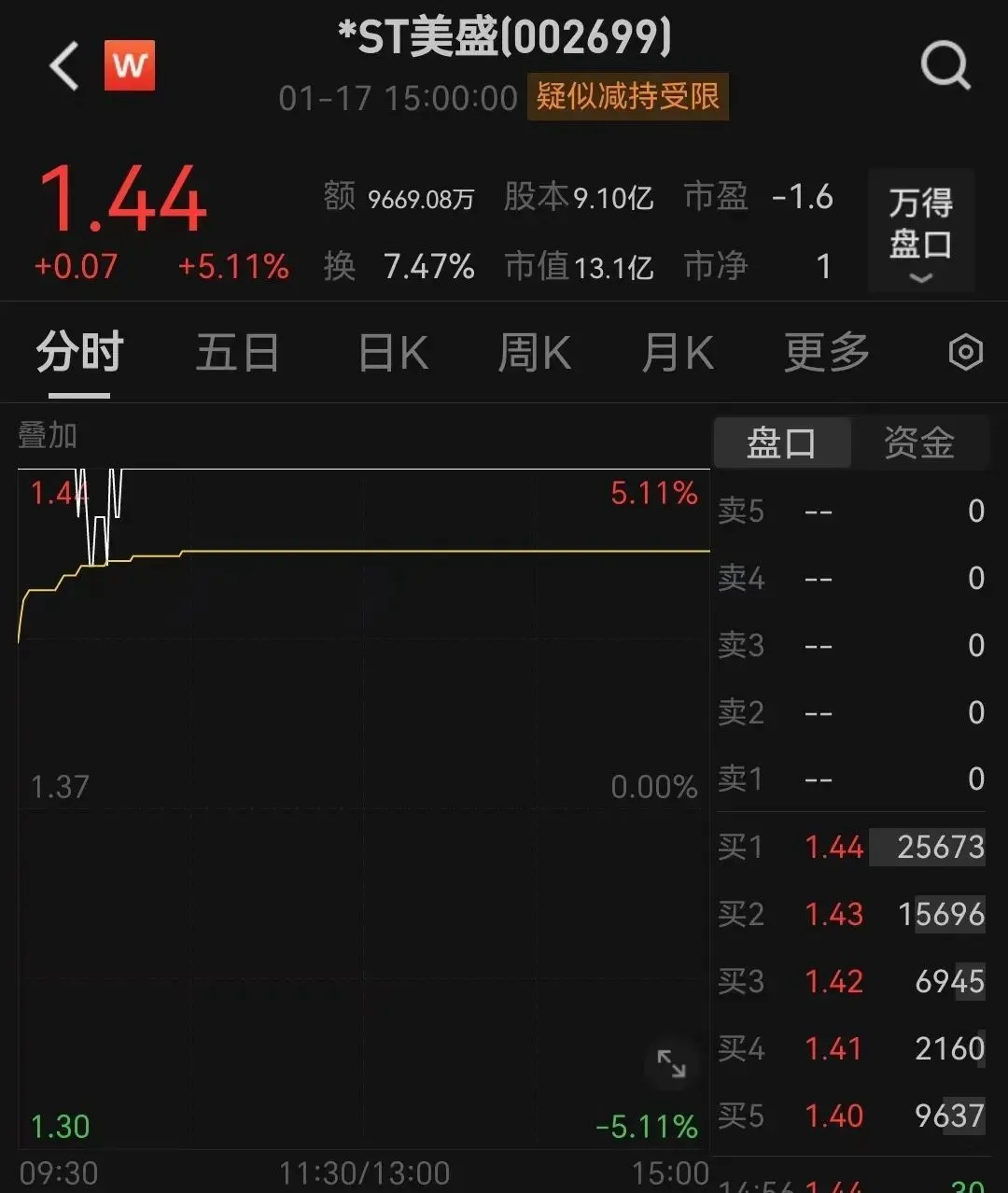 2024年1月16日晚间,*ST美盛公告,当日通过集中竞价交易方式首次回购股份100万股,占公司总股本的0.11%,成交价为1.37元/股,支付的回购总金额137万元。当天*ST美盛股价涨停。