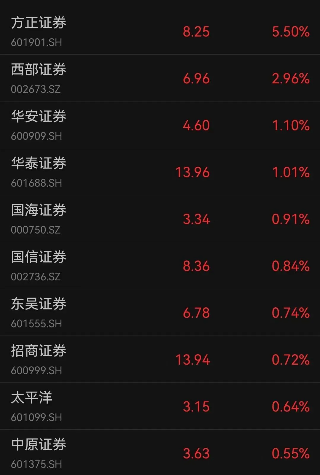 在方正证券股价拉升刺激下,券商指数也由绿翻红。西部证券、华安证券等跟涨。