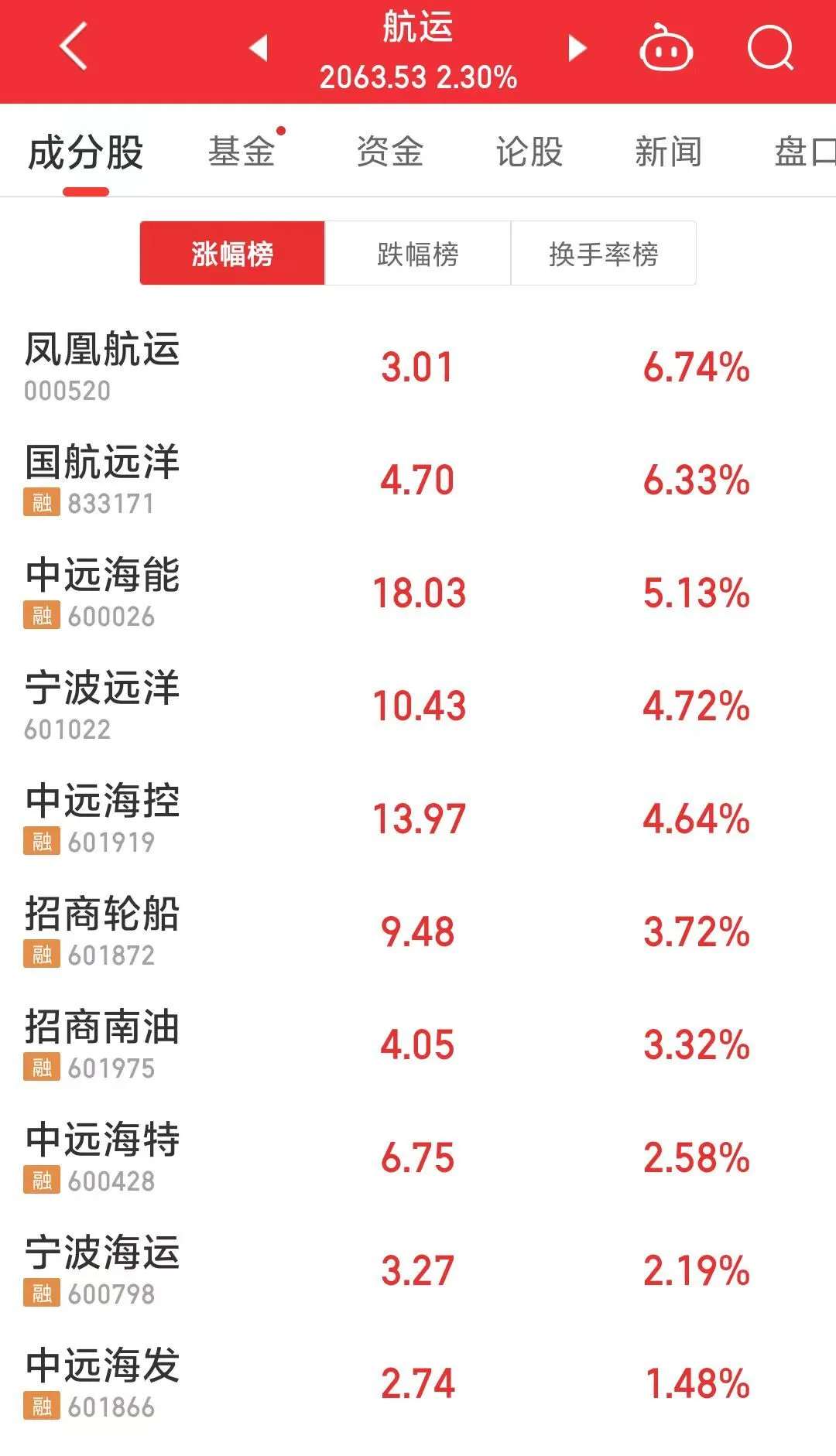 A股航运板块也创阶段新高,截至早盘收盘,凤凰航运、国航远洋涨超6%,中远海能涨超5%,宁波远洋、中远海控涨超4%,招商轮船、招商南油等个股跟涨。