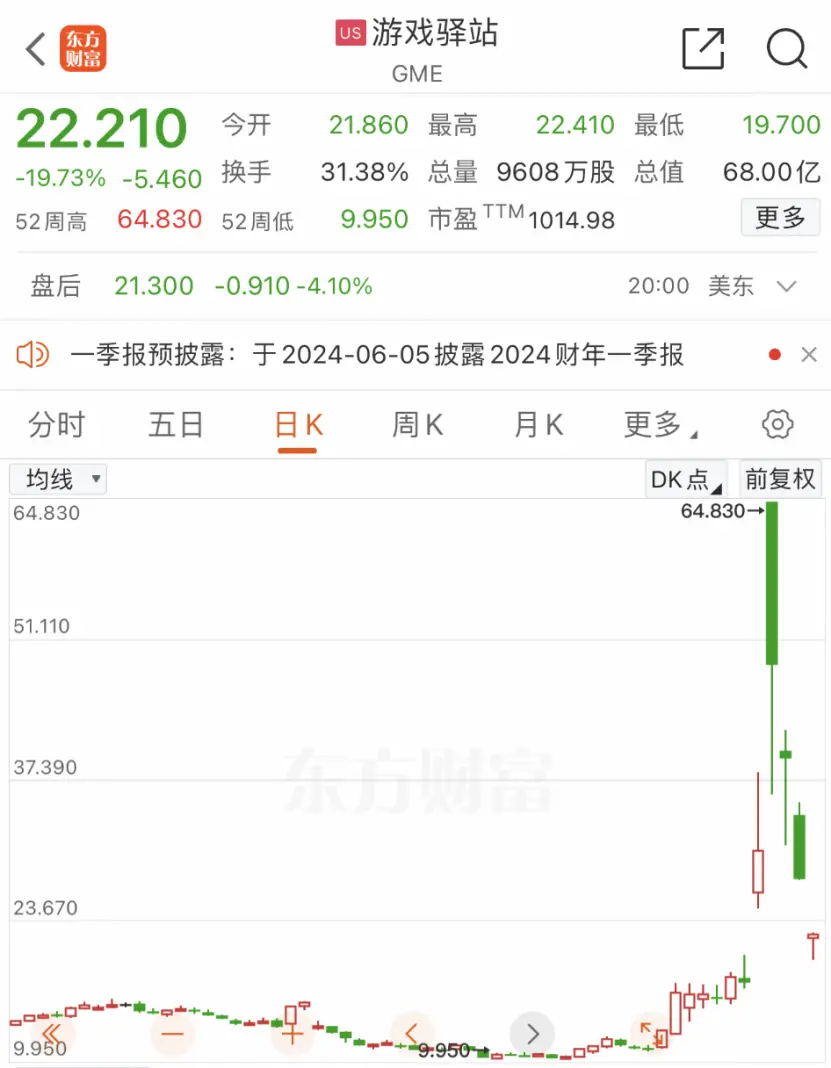 受此利空消息的影响,游戏驿站股价瞬间暴跌,盘中一度跌超28%,截至收盘,跌幅仍高达19.7%,最新股价报22.21美元,总市值缩水至68亿美元(约合人民币491亿元)。