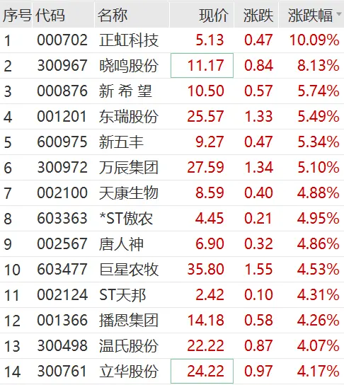 另外,上午农林牧渔板块走高,猪肉股普涨,正虹科技开盘迅速涨停,晓鸣股份、新希望、新五丰等多股跟涨,温氏股份盘中涨超5%。