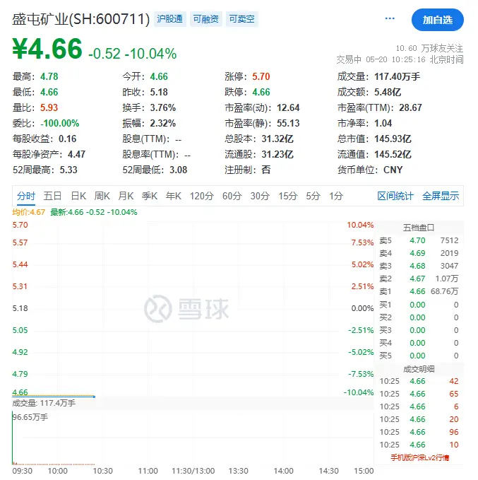 5月20日上午,盛屯矿业在集中竞价阶段即触及跌停。截至发稿,盛屯矿业股价为4.66元/股,跌幅10.04%;卖一超68万手,当前总市值146亿元。