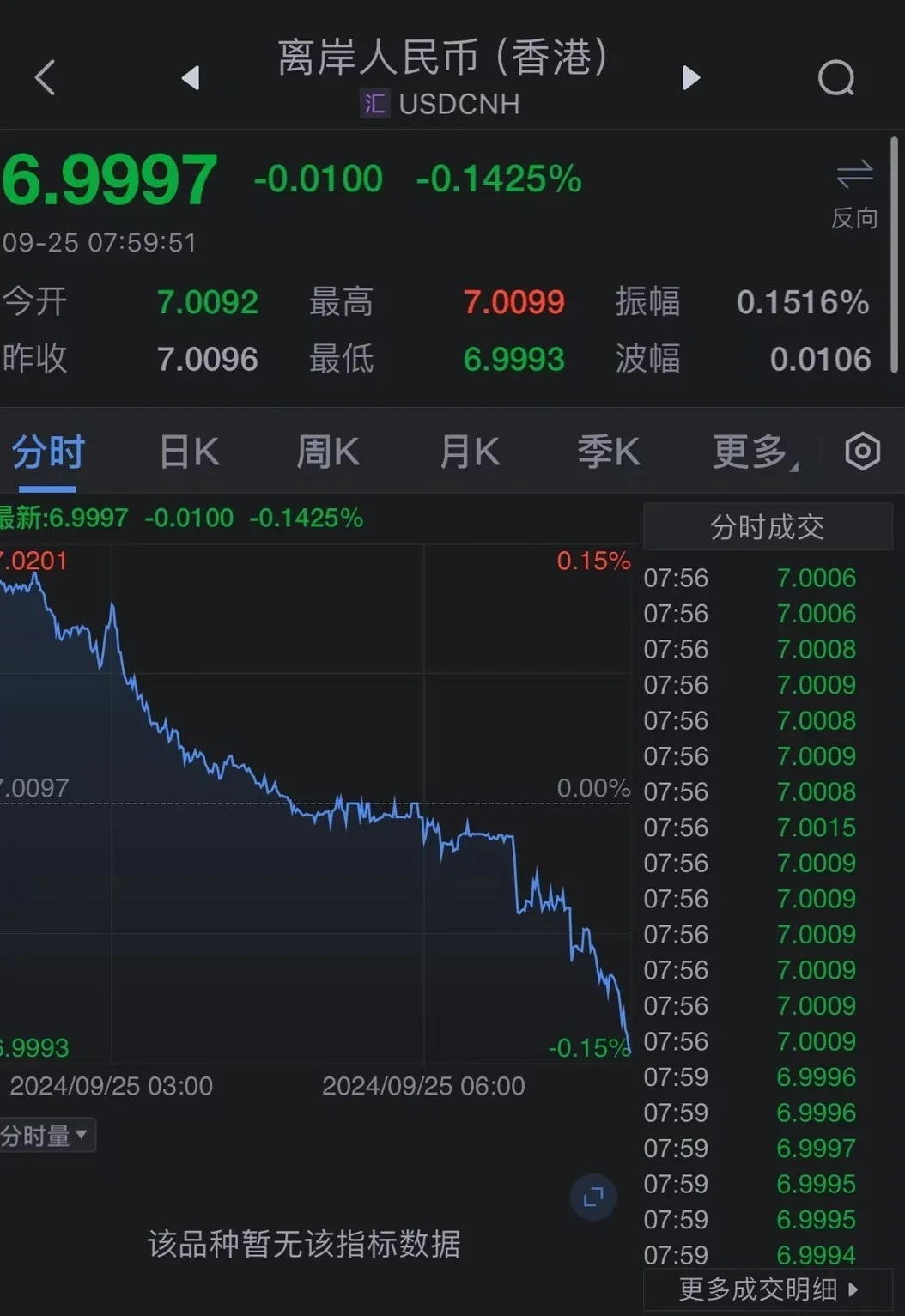 今日早盘,离岸人民币兑美元收复7.0关口,为去年5月以来首次。