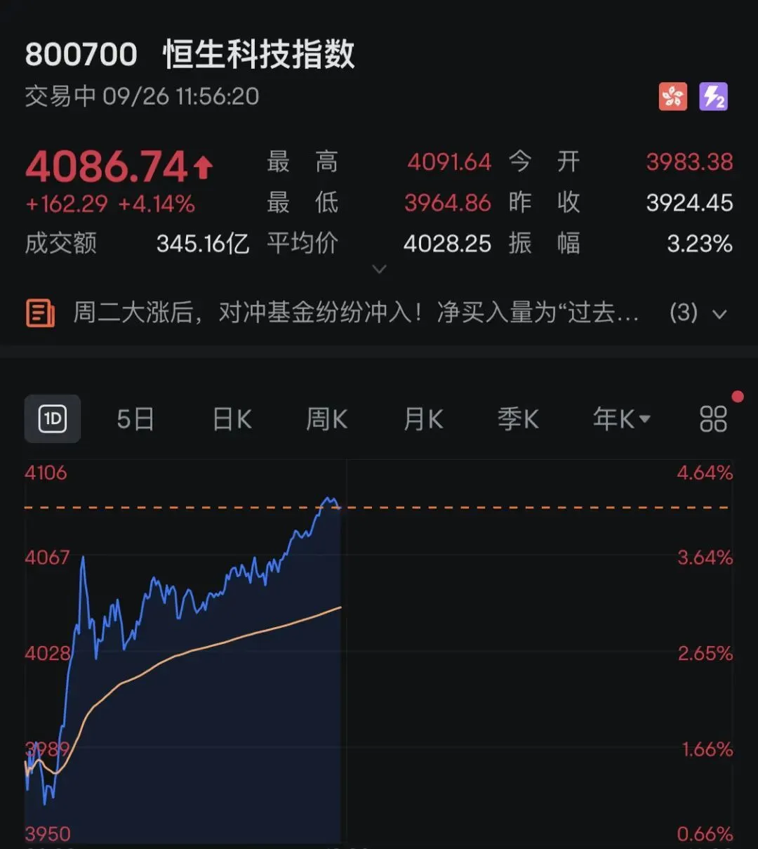 港股方面,恒生指数延续涨势,涨超2%,恒生科技指数更是大涨超4%。