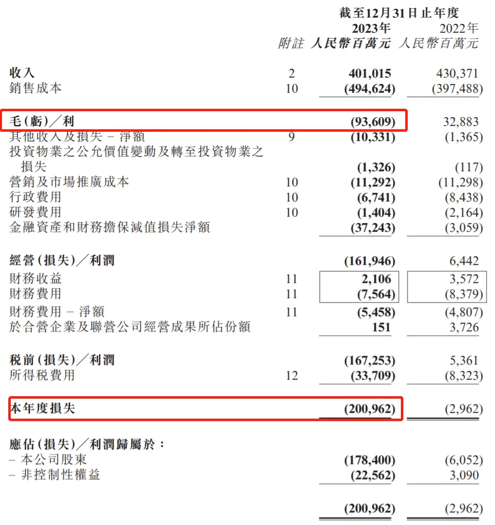 2023年,碧桂园的毛利为-936亿,毛利率-23.34%。