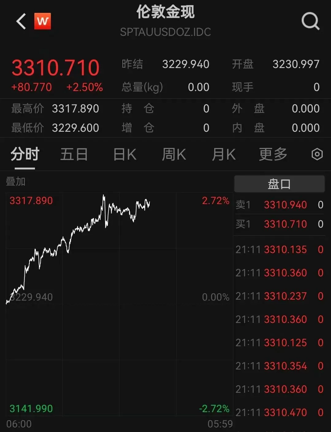 4月16日,国际金价再次走强,伦敦金现日内涨超2%,并首次站上3300美元/盎司。