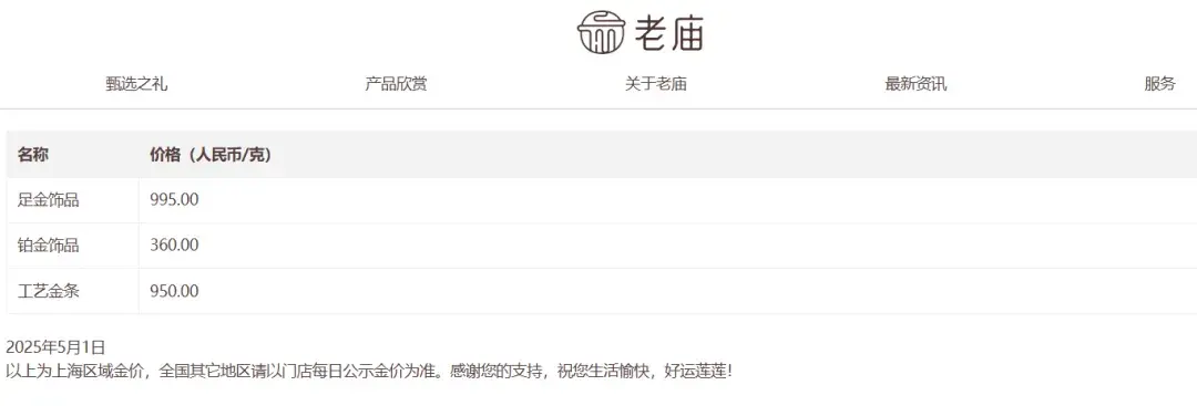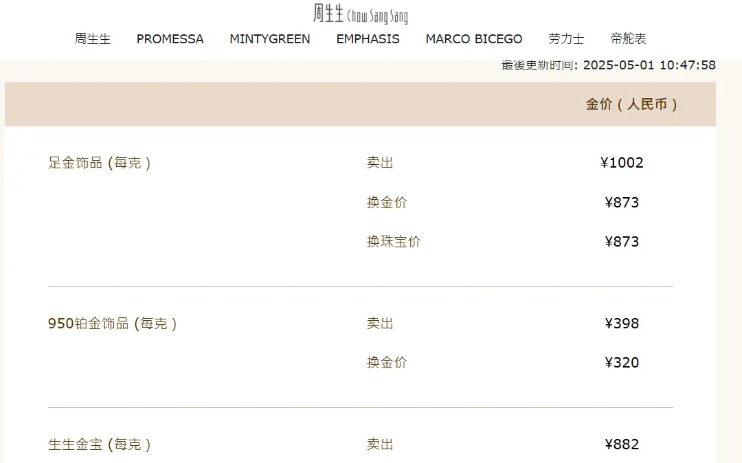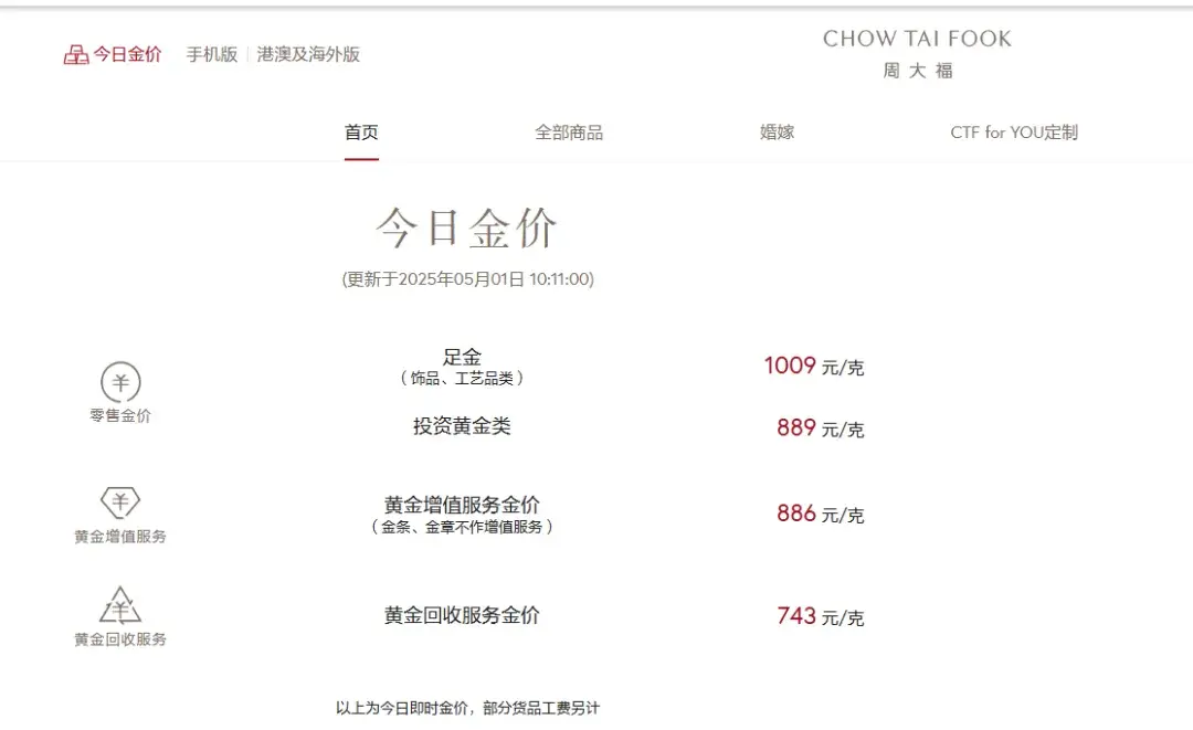 同日,多个金饰品牌也下调足金饰品价格。其中,老庙足金饰品价格995元/克、周生生足金饰品1002元/克、周大福足金饰品1009元/克。