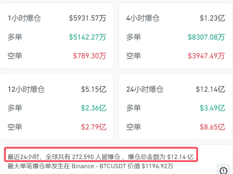 价格的急速上涨,导致不少空单爆仓。coinglass数据显示,24个小时内,加密货币全网合约爆仓12.14亿美元,爆仓人数超过27万人。其中空单爆仓8.65亿美元。最大单笔爆仓单发生在Binance-BTCUSDT,价值1196.92万美元。