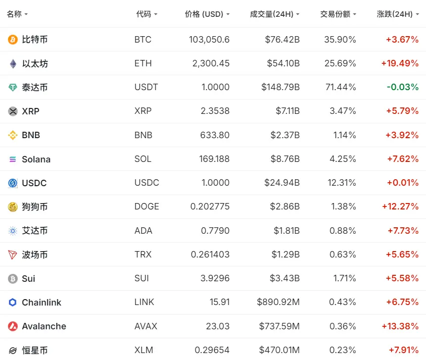 截至晚上23时,加密货币的涨幅有所收窄,24小时内,比特币上涨3.67%,价格报10.3万美元,这也是比特币自2月以来首次突破10万美元大关;以太坊涨超19%,价格报2300美元;狗狗币涨超12%,艾达币、Solana涨近8%。