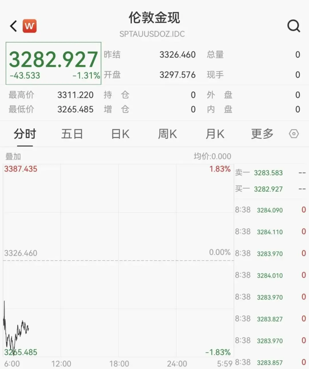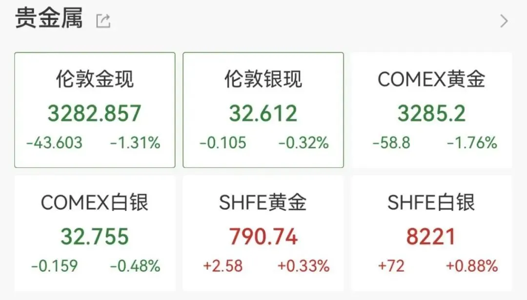 市场避险情绪缓解,现货黄金跌幅一度扩大至1.8%,现约报3283美元/盎司。