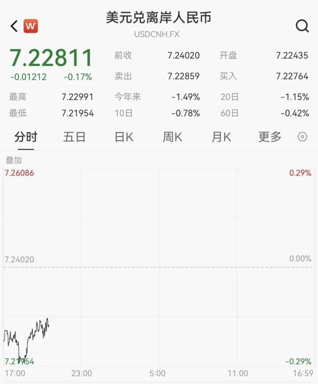 离岸人民币盘中突然拉升逾200点,随后震荡调整。截至发稿,离岸人民币兑美元升逾120个基点,现报7.2281。