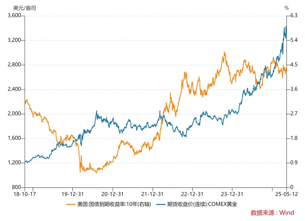 当美债的“无风险”标签被质疑时,金价和美债收益率也就出现了背离。Wind数据显示,2024年美国10年期国债实际收益率均值达2.1%(过去十年最高区间),但同期黄金价格却上涨23%,意味着黄金的货币属性开始占主导地位。