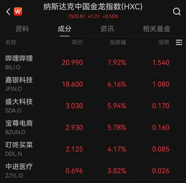 热门中概股方面,截至北京时间6月11日23:04,纳斯达克中国金龙指数涨0.55%,哔哩哔哩涨近8%,嘉银科技、盛大科技、宝尊电商、叮咚买菜涨逾4%。