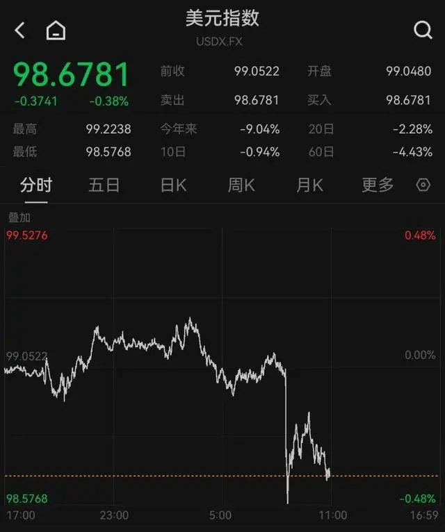 美元指数一度跳水后震荡拉升,截至北京时间6月11日22:55,其盘中跌幅收窄至0.38%。