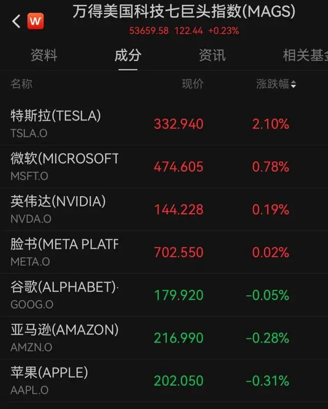 万得美国科技七巨头指数盘初冲高回落,截至北京时间22:54,成分股中特斯拉涨超2%,微软、英伟达、Meta跟涨,谷歌、亚马逊、苹果小幅下跌。