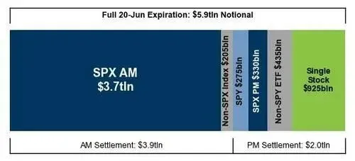 高盛衍生品专家约翰·马歇尔(John Marshall)也估计,本周五将有超过5.9万亿美元的名义期权敞口到期,其中包括4万亿美元的标普500指数期权和9250亿美元的个股期权。