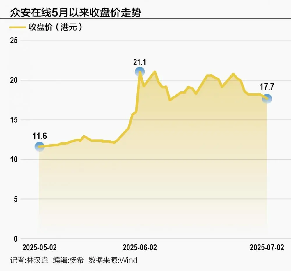 随后,众安在线财产保险股份有限公司(以下简称“众安保险”,06060.HK)因持有众安银行(ZA Bank)43.43%股份,5月份以来至最新收盘日累计涨幅近60%,在6月19日达到年内高点22.75港元,7月2日收盘价为17.7港元。