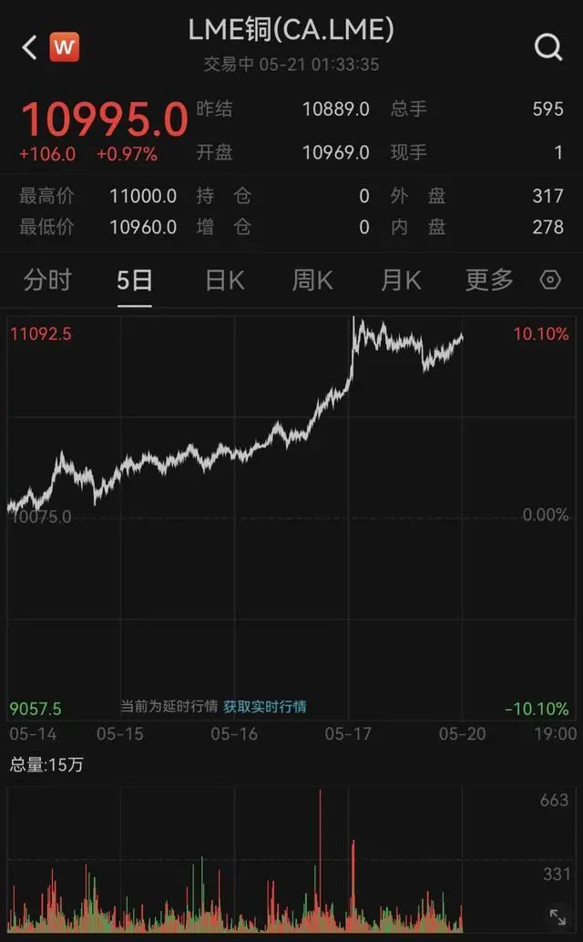 伦铜日内上涨1%,触及11000美元高位。
