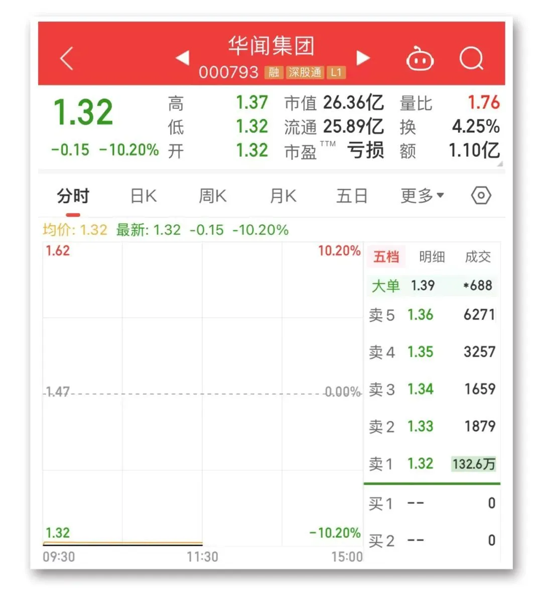 今天上午,华闻集团开盘仅几秒钟的时间,股价就跌停。上午收盘,跌停板上仍有近133万手大单,最新收盘价为1.32元。此前,该股连续8个交易日收出7个涨停板。