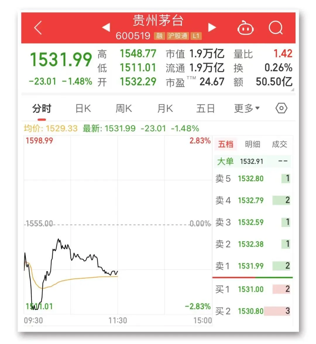 今天上午,贵州茅台下跌1.48%,盘中一度跌近3%,股价再创今年以来新低。