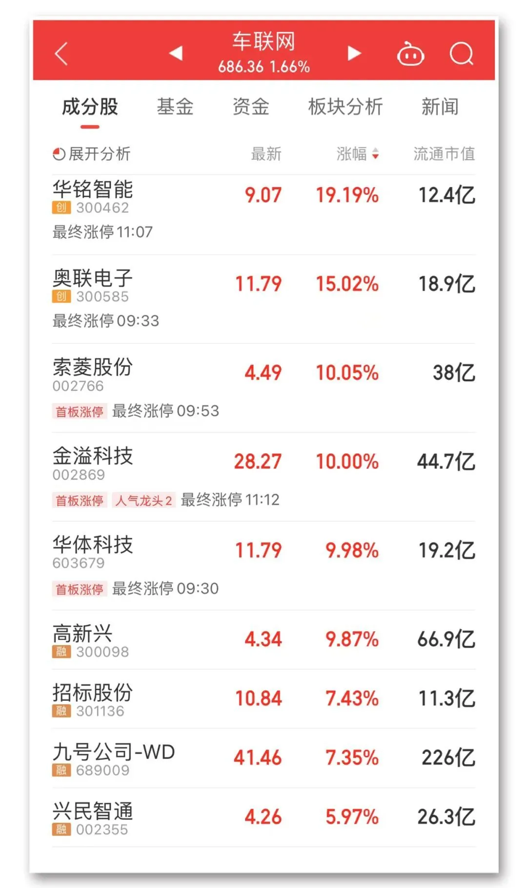 今天上午,车联网、无人驾驶、智能交通等“车路云”一体化相关板块走强,华铭智能、奥联电子等个股涨幅居前。
