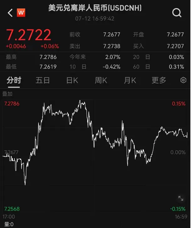 截至7月12日17时,境内在岸市场人民币兑美元汇率(CNY)徘徊在7.2649附近,境外离岸市场人民币兑美元汇率(CNH)触及7.2772。